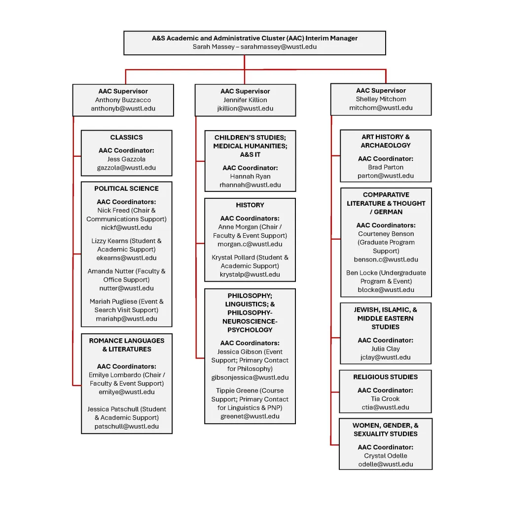 The Academic and Administrative Cluster (AAC) provides staffing for 17 departments and programs in Arts & Sciences.