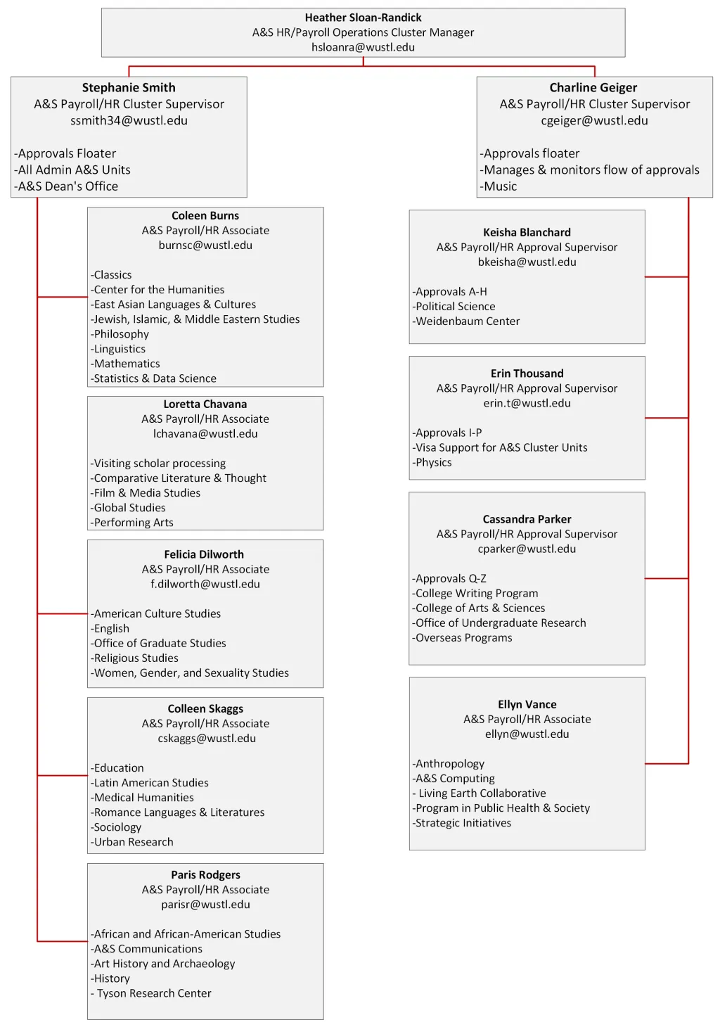 The HR/Payroll Cluster supports human resources and payroll matters for Arts & Sciences departments. The cluster processes all HR and payroll related tasks including new hires, onboarding, compensation, job, and pay rate changes, leaves, terminations, and transfers, assists with time reporting, vacation, and sick issues, visa processing and verification, and salary sourcing allocations. The cluster runs and reviews payroll and HR reports for accuracy and makes corrections when needed. The HR/Payroll Cluster works closely with department chairs and program directors, faculty members, and departmental staff.